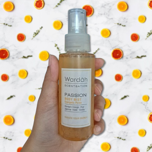 body mist passion wardah 100ml aroma terdiri dari mandarine orange dan floral jasmine dengan kombinasi dari aroma violet dan pear. Diformulasikan tanpa pewarna sehingga tidak meninggalakn noda pada pakaian atau tubuh.